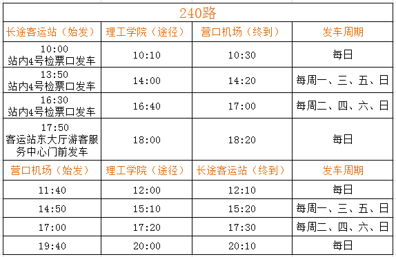 經(jīng)公司營(yíng)運(yùn)部門(mén)與機(jī)場(chǎng)工作人員溝通:從2018年3月25日起,營(yíng)口藍(lán)旗機(jī)場(chǎng)執(zhí)行新的航班時(shí)刻表(部分航線(xiàn)停發(fā))。針對(duì)上述情況,為方便市民出行,經(jīng)公司研究,現(xiàn)對(duì)機(jī)場(chǎng)240路運(yùn)營(yíng)班次進(jìn)行調(diào)整。具體內(nèi)容如下: